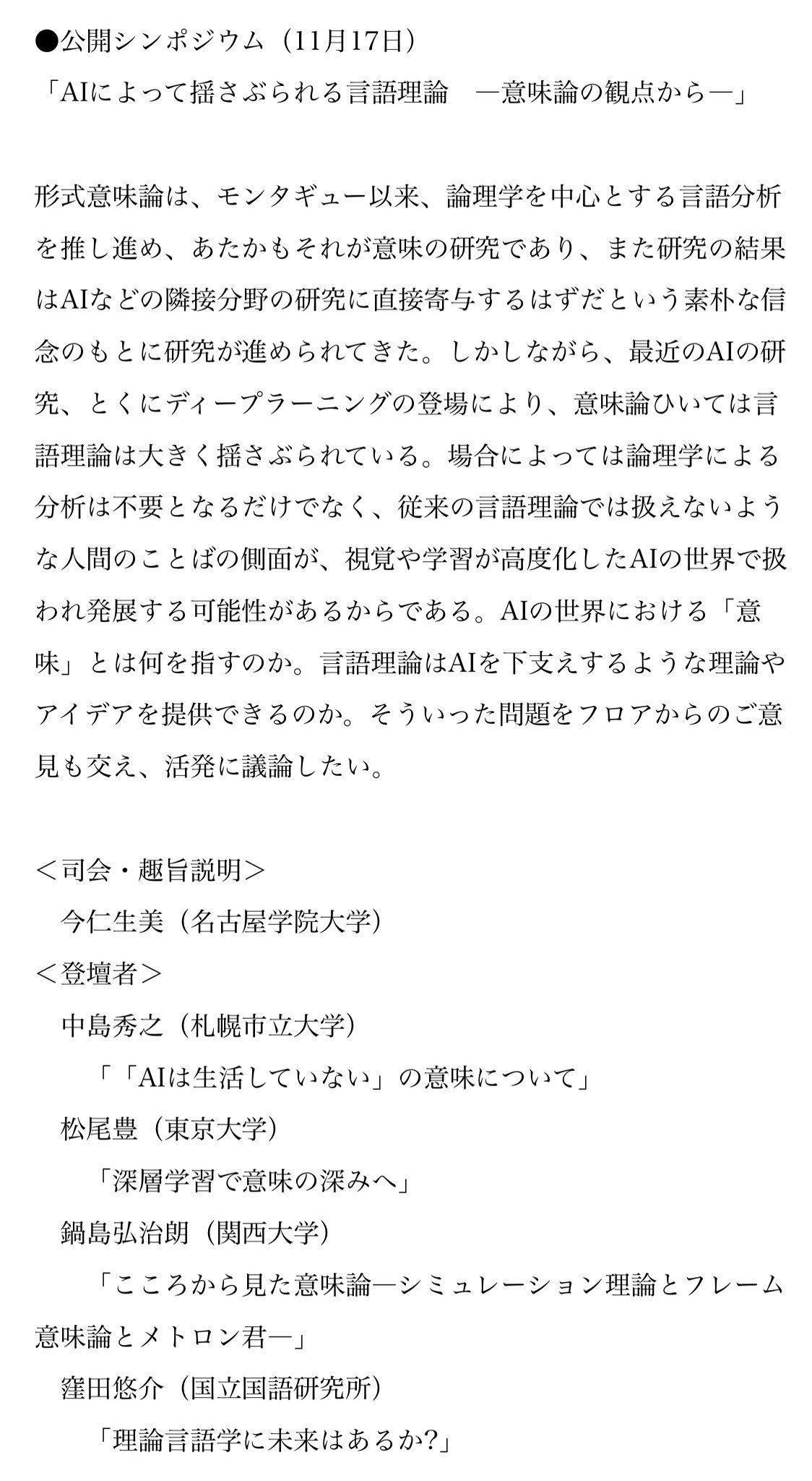 深い森 On Twitter もうこれ 題目見ただけで面白いじゃん 日本言語学会第159回大会 2019年11月16日 土 17日 日 名古屋学院大学名古屋キャンパスしろとり 公開シンポジウム Aiによって揺さぶられる言語理論 意味論の観点から Https T Co R8h8zcwt9f